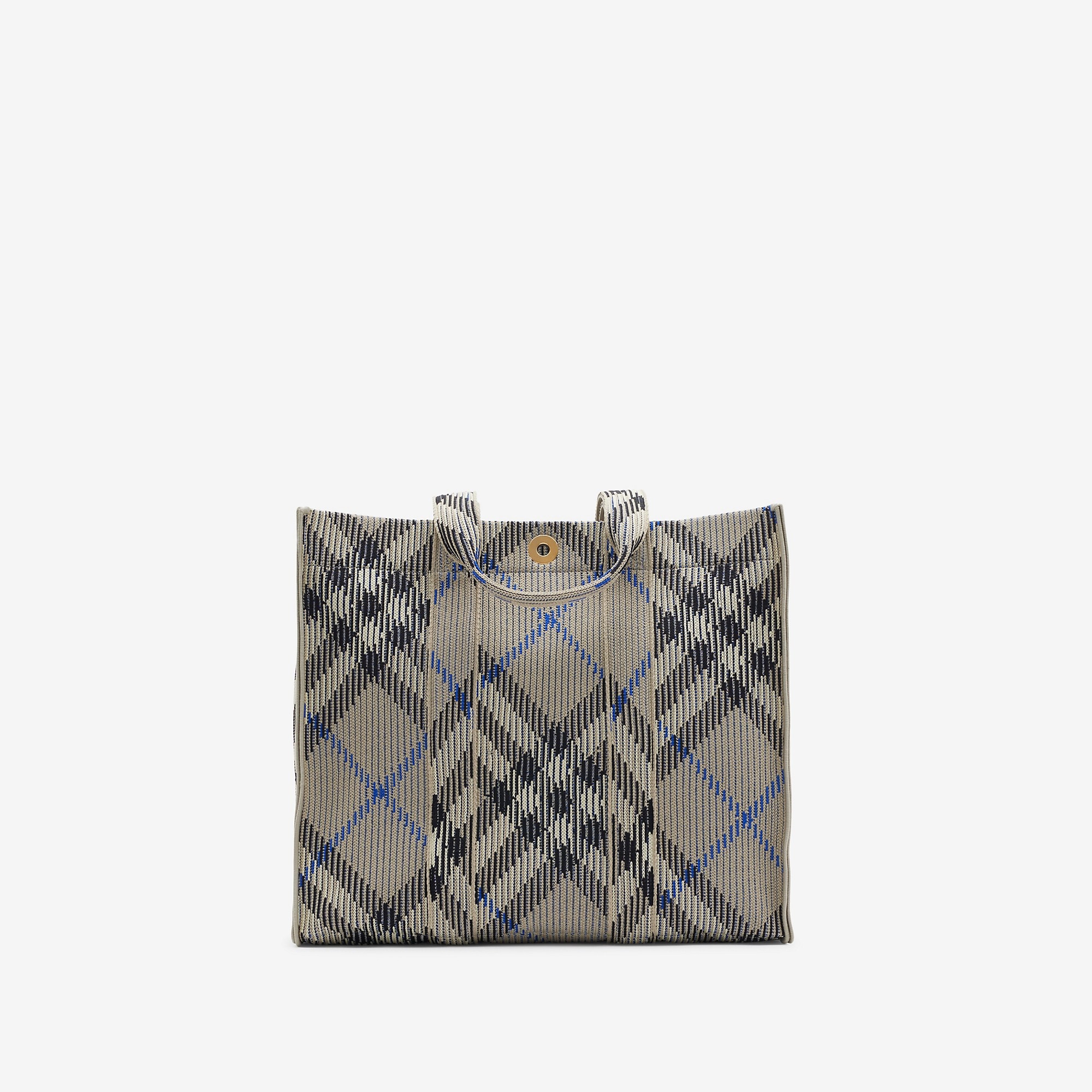 Product Details A softly structured tote knitted in Italy with the Burberry Check. The lightweight bag is unlined and finished with a press stud engraved with the Equestrian Knight Design. - Top handles - Press-stud closure - Interior zip pocket - Brushed metal hardware - Engraved Equestrian Knight Design at fastening - Unlined - Comes with a dust bag - Item 80904051 Size & Fit - 40 x 17.5 x 36cm/15.8 x 6.9 x 14.2in. Handle drop: 25cm/9.8in Fabric & Care - 100% polyamide - Trim: 53% cotton, 47% polyurethane - Made in Italy