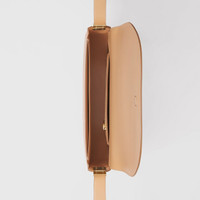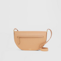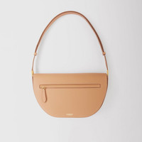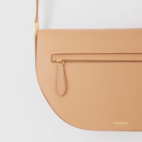 PRODUCT DETAILS A runway shoulder bag with a curved silhouette, sculpted from a soft matte French leather which develops a natural patina over time. The slim, structured style features gold-plated hardware and exterior slip and zip pockets for easy access. 30 x 5.5 x 18cm/11.8 x 2.2 x 7.1in Min. shoulder strap drop: 27cm/10.6in Max. shoulder strap drop: 48cm/18.9in Outer: 100% calf leather Linings: 100% lambskin; 60% cotton, 40% polyester Adjustable shoulder strap One exterior zip pocket, one exterior slip pocket, one interior zip pocket, two interior slip pockets Foldover top with magnetic closure Hand-painted edges Polished metal hardware Embossed Burberry lettering at front Made in Italy 80430871