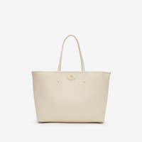 Product Details A spacious tote made in Italy from grainy calf leather, reversing to a Burberry Check cotton linen blend in seasonal light beige. The Bloomsbury collection is finished with a leather and metal Knight stamp, an archival motif first seen on Burberry bags in the 1980s. Comes with a detachable press-stud pouch to secure smaller items. - Top handles - Detachable pouch - Hand-painted edges - Brushed metal hardware - Leather patch with Equestrian Knight Design at front - Comes with a dust bag - Item 81195971 Size & Fit - 37.5 x 17 x 30cm/14.8 x 6.7 x 11.8in. Handle drop: 23cm/9.1in Fabric & Care - Outer: 100% calf leather - Reverse: 69% cotton, 21% viscose, 10% linen - Made in Italy