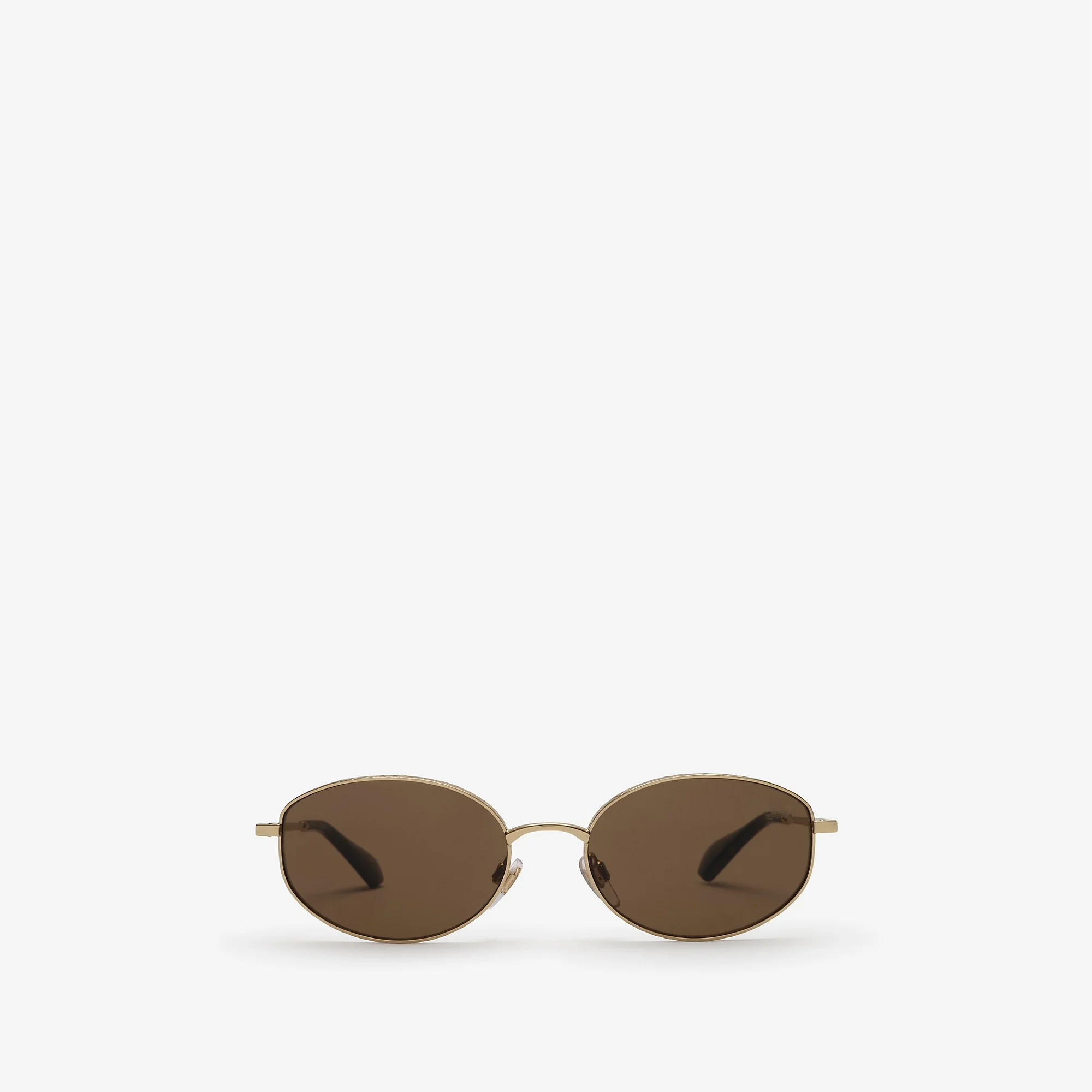 Product Details A pair of oval sunglasses made in Italy from metal with tortoiseshell temple tips. The slender silhouette is laser-engraved with our logo and the Burberry Check, referencing the hardware of some of our most iconic bags. - Item 40854711 Size & Fit - Frame width: 14.1cm/5.6in. Frame height: 4cm/1.6in Fabric & Care - 100% metal - Made in Italy