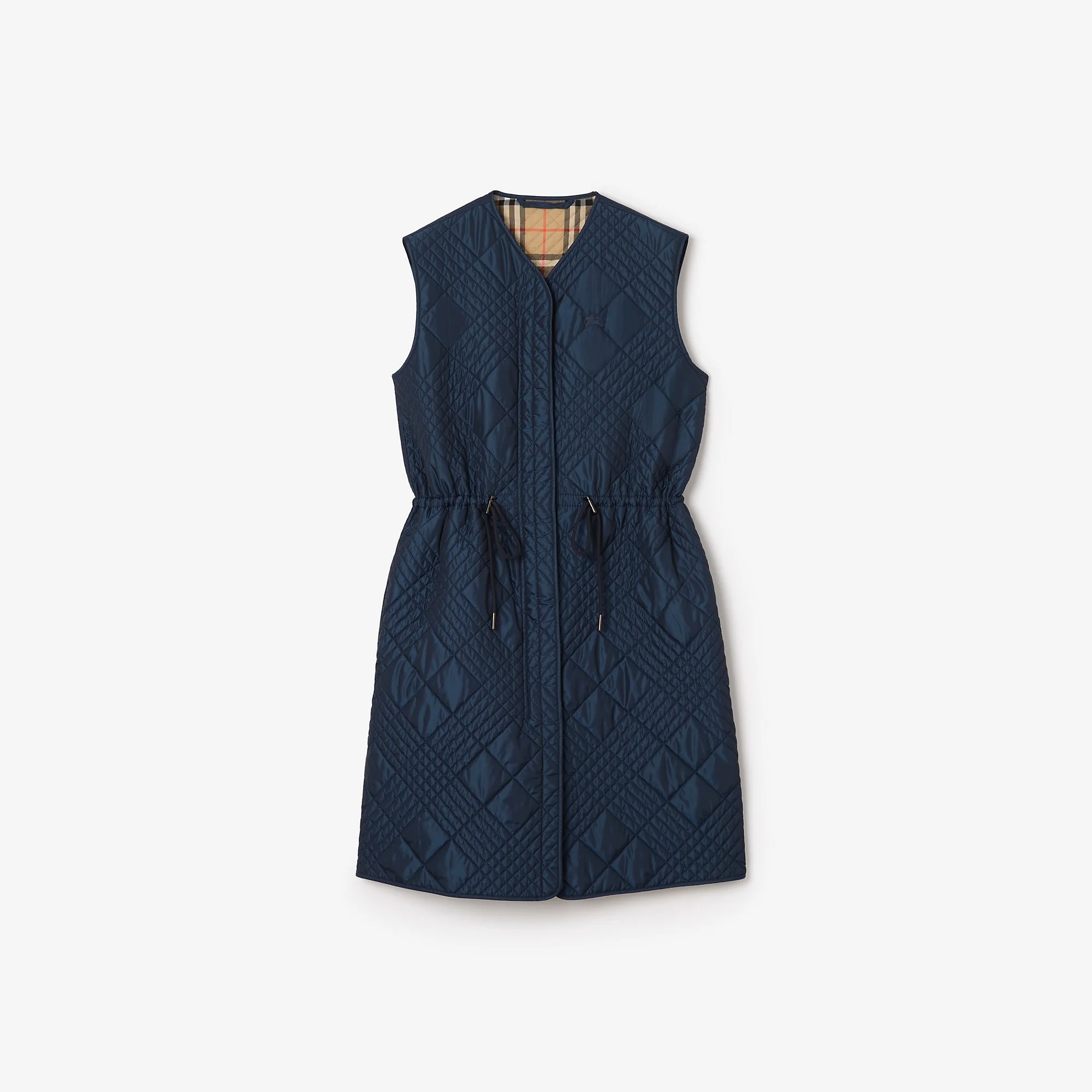 Product Details Regular fit. Fits true to size, take your normal size. A long quilted gilet in a lightweight changeant nylon blend, an archive-inspired fabric woven with contrasting yarns for a subtle sheen. The design is detailed with our micro check-stitch – a new take on quilted stitching inspired by the iconic house code. Shaped to a regular fit with a drawcord waist, the silhouette is lined with Burberry Check cotton twill and embroidered with a tonal Equestrian Knight Design. - Two-way zip and press-stud closure - Drawcord waist - Side slip pockets - Embroidered Equestrian Knight Design at chest - Burberry Check lining - Comes with a garment bag - Item 81187231 Size & Fit - Regular fit. Fits true to size, take your normal size. - Length: 95cm/37.4in (size UK S) Fabric & Care - Outer: 70% polyamide, 30% polyester - Lining: 100% cotton - Filling: 100% polyester fibres - Specialist dry clean - Imported