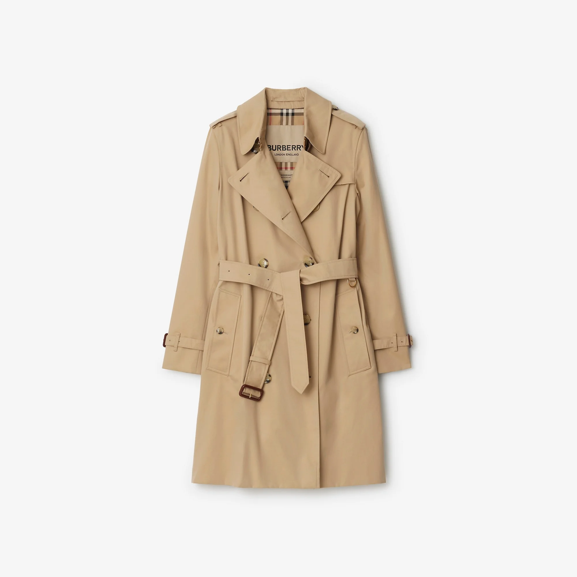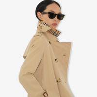 Product Details The iconic Burberry trench coat, made in England from shower-resistant cotton gabardine. Inside is Burberry Check cotton, used to line our coats since the 1920s. Part of the Heritage Collection, the Kensington is cut to a regular fit with set-in sleeves. - Double-breasted button closure - Hook-and-eye collar closure - Throat latch - Epaulettes - Belt - Side button welt pockets - Belted cuffs - Back button vent - Burberry Check lining and undercollar - Regular fit. Fits true to size, take your normal size. - Item 80794111 Size & Fit - Length: 97cm/38.2in (size UK 10) - Model’s height: 178cm/5ft 10in. Model wears size UK 10 Fabric & Care - Outer: 100% cotton - Lining: 100% cotton - Sleeve lining: 100% viscose - Buckles: 100% calf leather - Specialist dry clean - Made in Yorkshire, England