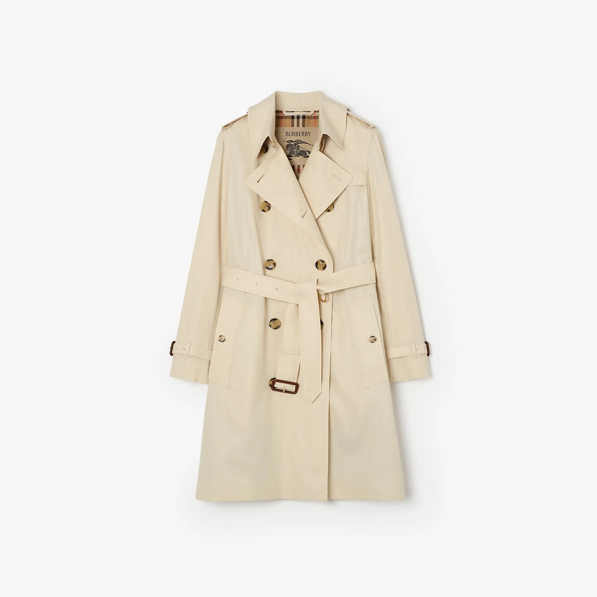 Product Details Marking 170 years of Burberry, our timeless Kensington trench coat is refreshed in a lighter weight. The double-breasted silhouette is crafted from shower-resistant tropical gabardine – the lightest of our signature fabrics, developed for warmer climates. Tailored to a regular fit with a structured shoulder, added ease through the body allows for effortless layering. Wear it belted or open to showcase the iconic Burberry Check lining. - Item 81257631 Size & Fit - Regular fit. Fits true to size, take your normal size. - Length: 96cm/37.8in (size UK 8) Fabric & Care - Outer: 100% cotton - Undercollar: 100% cotton - Lining: 100% cotton - Sleeve lining: 100% viscose - Pocket lining: 100% cotton - Buckles: 100% calf leather - Specialist dry clean - Made in Italy