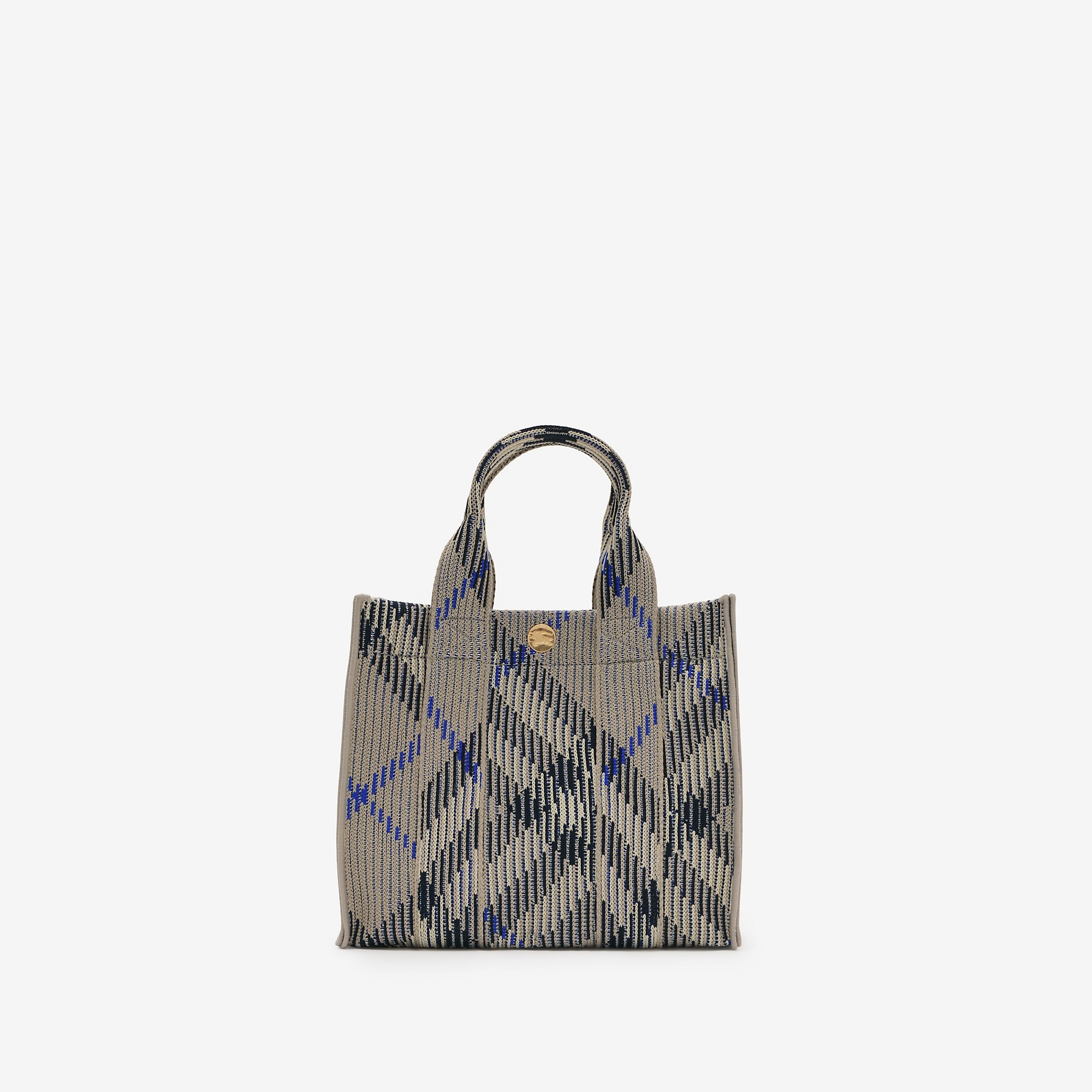 Product Details A softly structured tote knitted in Italy with the Burberry Check. The lightweight bag is unlined and finished with press stud engraved with the Equestrian Knight Design. Detachable crossbody strap Press-stud closure Interior zip pocket Brushed metal hardware Engraved Equestrian Knight Design at fastening Unlined Comes with a dust bag - Item 80904041 Size & Fit - 25 x 11 x 22cm/9.8 x 2.6 x 8.7in. Min. strap drop: 45cm/ 17.7in. Max. strap drop: 48cm/ 18.9in Fabric & Care - 100% polyamide - Trim: 53% cotton, 47% polyurethane - Made in Italy