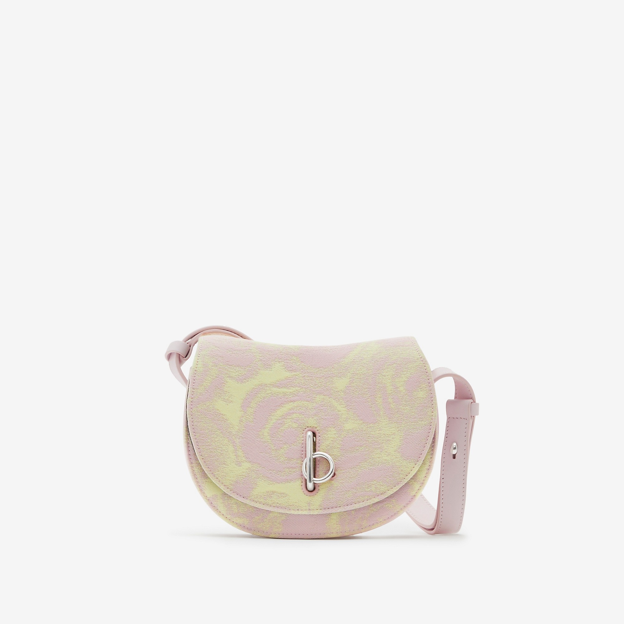 PRODUCT DETAILS A structured bag made in Italy from jacquard-woven wool silk with a seasonal rose pattern. The curved shape is inspired by childhood rocking horses and features the ‘b’ closure at the flap. A leather strap adjusts the design from a shoulder to crossbody bag. - 19 x 6 x 16cm/7.5 x 2.4 x 6.3in - Min. strap drop: 31.5cm/12.4in - Max. strap drop: 61cm/24in Outer: 98% wool, 2% silk Trim: 100% calf leather Lining: 100% lambskin Made in Italy Item 80815161
