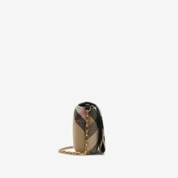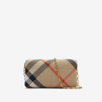 Product Details A compact bag made in Italy from a water-repellent cotton blend, jacquard-woven with the Burberry Check. Mirroring the shape of the B-cut hardware, the versatile style features geometric topstitching and a tonal leather lining. Detach the chain-link strap to switch the design from a shoulder bag to a clutch. - Detachable chain strap - Foldover flap with clasp closure - Six card slots - Exterior slip pocket - Hand-painted edges - Brushed metal hardware - Leather lining - Comes with a dust bag - Item 81036971 Size & Fit - 21 x 6 x 13.5cm/8.3 x 2.4 x 5.3in . Strap drop: 50cm/19.7in Fabric & Care - Outer: 65% polyester, 35% cotton - Linings: 100% lambskin; 53% cotton, 47% polyurethane - Made in Italy