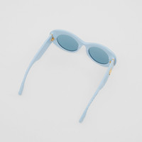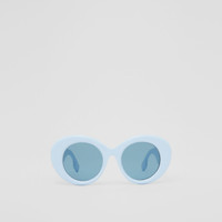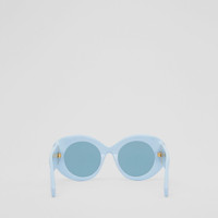 PRODUCT DETAILS An oversized round frame milled from light blue acetate, detailed with the Thomas Burberry Monogram. The bold silhouette features textural temples referencing our Burberry Check – inspired by the signature Lola bag. The acetate used for the front of the frames is made with at least 25% recycled content and the bio-based nylon used for the arms contains at least 45% of bio-based content coming from castor oil, a renewable resource. Frame width: 14.8cm/5.8in Frame height: 6.1cm/2.4in Acetate frame Scratch-resistant baby blue lenses with 100% UV protection Made in Italy Comes with a hard leather case and cleaning cloth 40826451