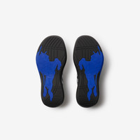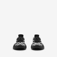 Product Details Italian-made sneakers with a breathable sock upper knitted with the Burberry Check. The leather-lined style features check laces with a B shield toggle and an oversized Equestrian Knight Design that wraps around the sole. - Rounded toe - Drawcord closure - Equestrian Knight Design at the sole - Comes with a dust bag - Item 80993281 Fabric & Care - Upper: 92% polyester, 4% elastane, 4% polyamide* - Lining: 100% calf leather - Sole: 75% polyurethane, 25% thermoplastic polyurethane - *The main material of this product is made with at least 50% recycled content - Made in Italy