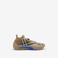 Product Details Italian-made sneakers with a breathable sock upper knitted with the Burberry Check. The leather-lined style features check laces with a B shield toggle and an oversized Equestrian Knight Design that wraps around the sole. Part of Burberry Classics, wardrobe foundations with a unique Burberry slant. - Rounded toe - Drawcord closure - Equestrian Knight Design at the sole - Comes with a dust bag - Item 80993261 Fabric & Care - Upper: 92% polyester, 4% elastane, 4% polyamide* - Lining: 100% calf leather - Sole: 75% polyurethane, 25% thermoplastic polyurethane - *The main material of this product is made with at least 50% recycled content - Made in Italy