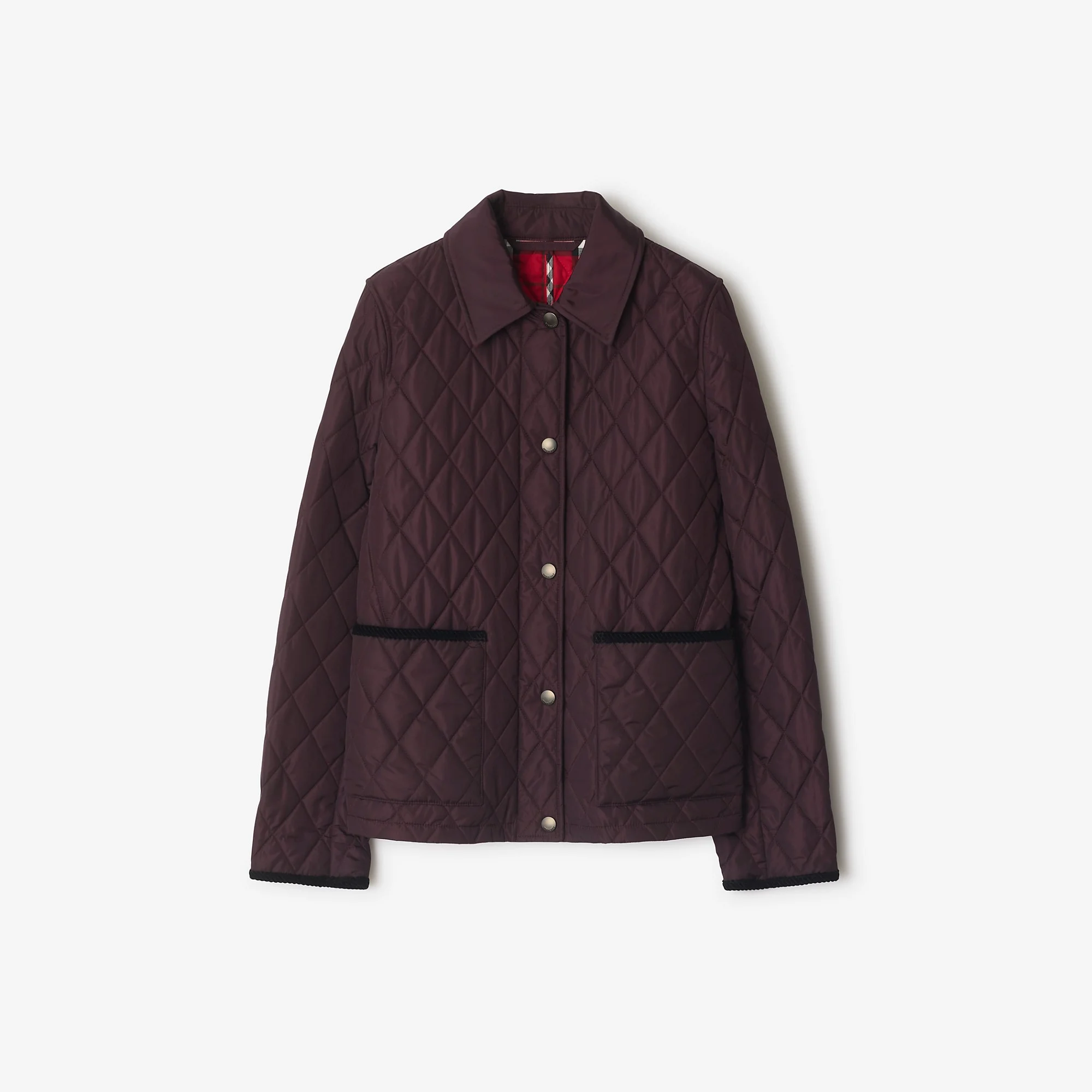 Product Details A special-edition quilted nylon jacket in seasonal wine red, lined with Burberry Check cotton twill. The style is cut to a slim fit with a corduroy collar and trims. - Press-stud closure - Side patch pockets - Burberry Check lining and undercollar - Equestrian Knight Design tab at side - Comes with a garment bag - Item 81156191 Size & Fit - Slim fit: this style is cut to a fitted silhouette. Fits true to size, take your normal size. - Length: 63cm/24.8in (size UK S) - Model’s height: 175cm/5ft 9in. Model wears size UK S Fabric & Care - Outer: 100% polyamide - Trim: 100% cotton - Lining: 100% cotton - Filling: 100% polyester fibres - Specialist dry clean - Imported