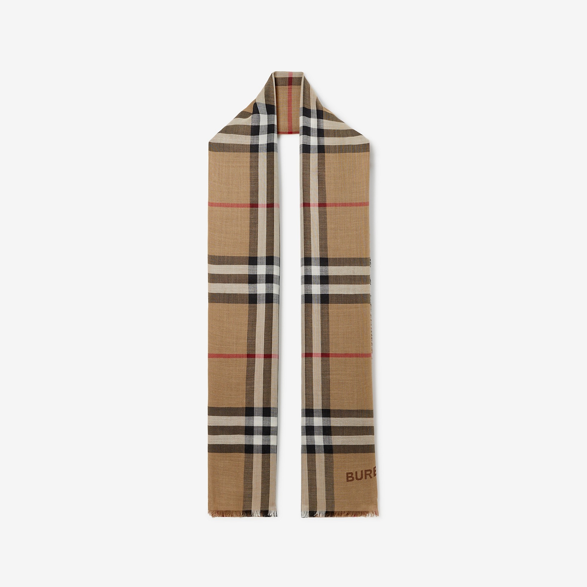 Product Details A wool-silk scarf in a lightweight gauze weave made in Italy. The reversible design is printed with the Burberry Check. - Rectangular - Eyelash fringing at the edges - Printed Burberry lettering - Item 80742001 Size & Fit - 220 x 70cm/86.6 x 27.6in Fabric & Care - 51% wool, 49% silk - Dry clean - Made in Italy