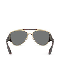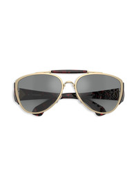 pilot-frame sunglasses Highlights - Gold-tone - Metal - Pilot frame - Grey tinted lenses - Double bridge - Nose pads - Straight arms - Curved tips - These glasses come with a protective case. Made in United States Composition Metal 100% SIZE & FIT Measurement Bridge Width 0.7 in(1.8 cm) Lens Diameter 2.36 in(6 cm)