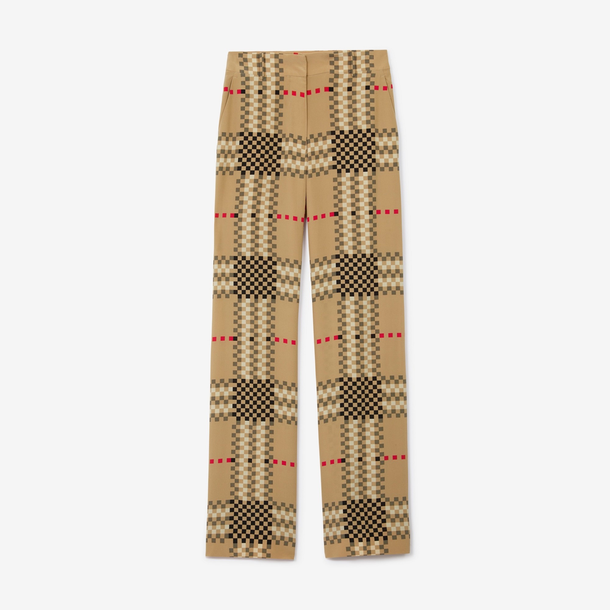 PRODUCT DETAILS High-waisted trousers in silk crepe de chine, styled with a wide leg and highlighted with a pixelated take on our Burberry Check. - Trouser inside leg length: 85cm/33.5in. This is based on a size UK 6 as proportions change slightly according to size. - Model’s height: 178cm/5ft 10in. Model wears size UK 6. Outer: 100% silk Lining: 100% silk Concealed hook-and-bar, button and zip fly closure Side slip pockets, back welt pockets Specialist dry clean Imported Item 80631051