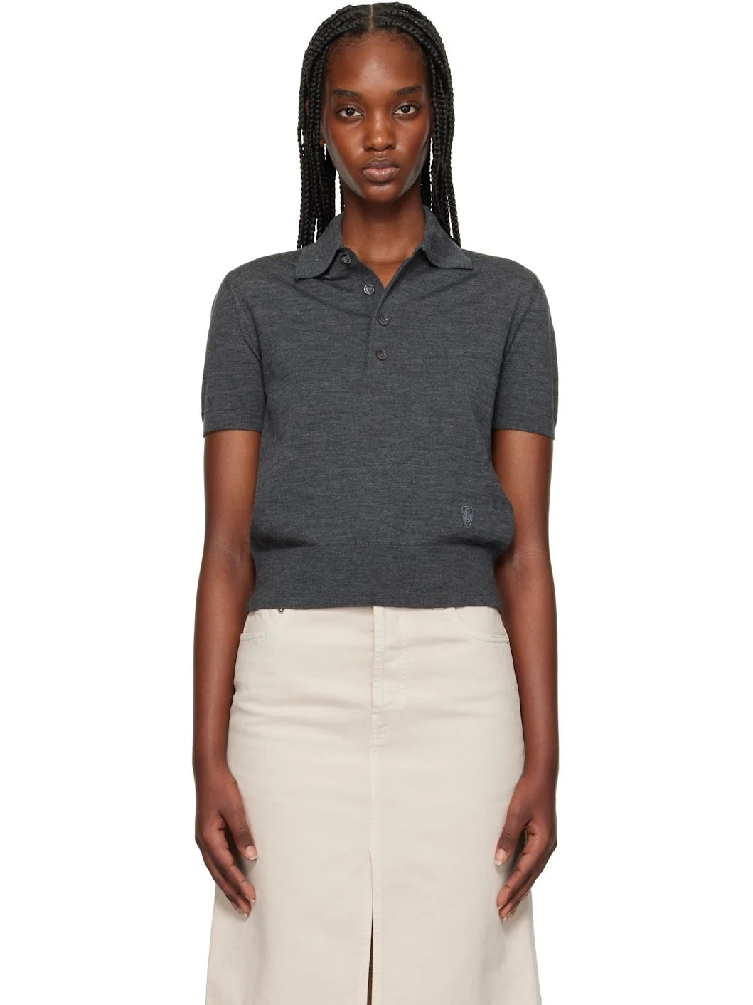 Lightweight wool jersey polo. · Rib-knit spread collar, hem, and cuffs · Four-button placket · Logo embroidered at front hem · Contrast stitching in blue at back central seam · Central vent at back hem · Mother-of-pearl hardware Supplier color: Mid grey Body: 100% wool. Trim: 91% wool, 7% polyamide, 2% elastane. Made in Italy 251376F108001
