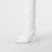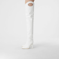 PRODUCT DETAILS Thigh-high heeled boots in Italian-tanned leather, contoured with a cut-out detail – a nod to the Spring/Summer 21 collection's maritime influences. Upper: 100% calf leather Trim: 100% polyester Lining: 99% sheep leather, 1% polyamide Sole: 100% leather Side zip closure Rounded toe Heel height: 10cm/3.9in Length from top of heel to top of boot: 72cm/28.3in Top circumference: 50.5cm/19.9in Made in Italy 80399811