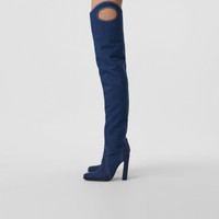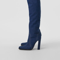 PRODUCT DETAILS Thigh-high heeled boots in topstitched denim, contoured with a cut-out detail – a nod to the Spring/Summer 21 collection's maritime influences. Upper: 100% cotton Trim: 100% polyester Lining: 99% sheep leather, 1% polyamide Sole: 100% leather Side zip closure Rounded toe Heel height: 10cm/3.9in Length from top of heel to top of boot: 72cm/28.3in Top circumference: 50.5cm/19.9in Made in Italy 80399751