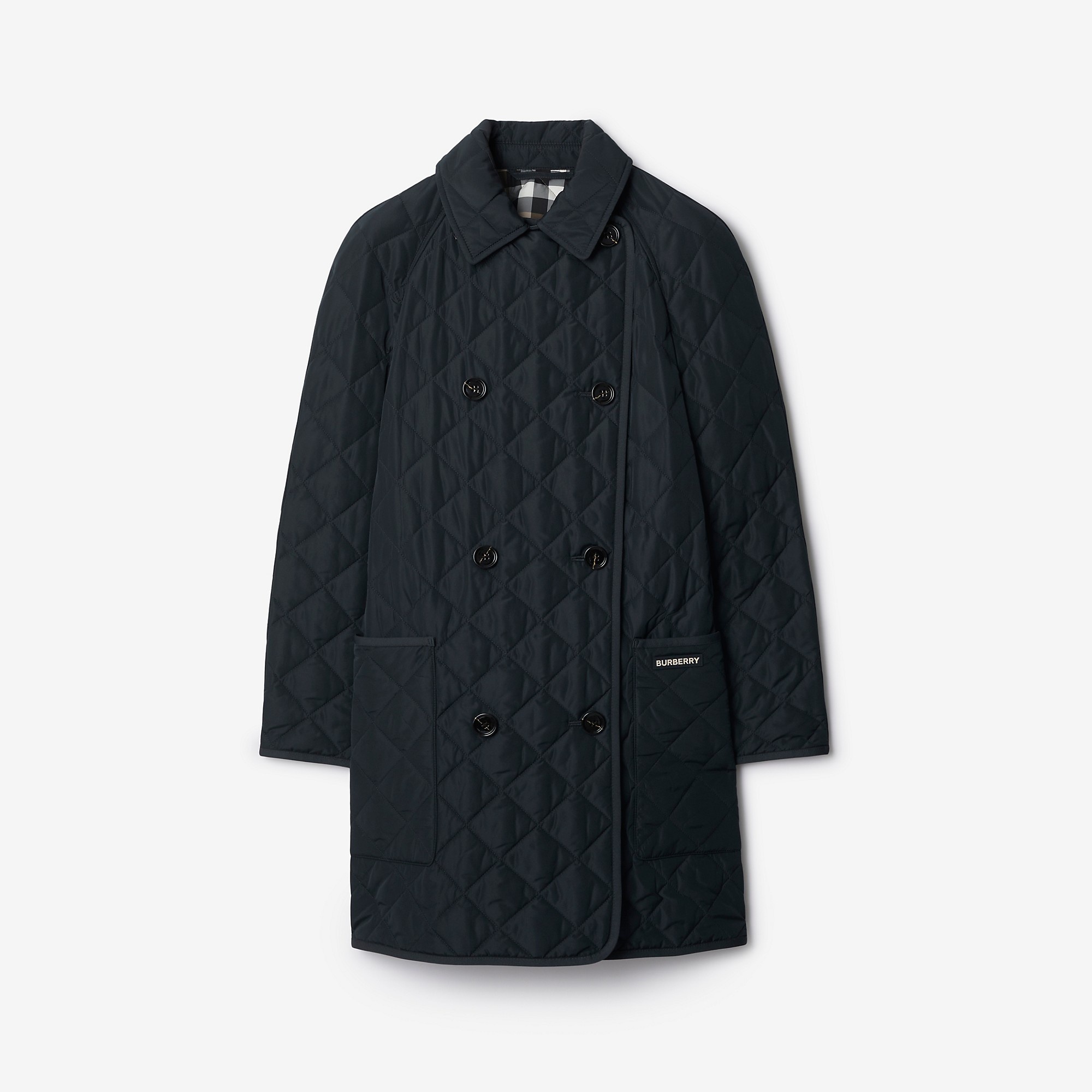 PRODUCT DETAILS A quilted coat with a logo appliqué and Burberry Check lining. - Length: 85cm/33.5in (size UK S) Outer: 100% polyester Lining: 100% polyester Filling: 100% polyester Specialist dry clean Imported Item 80847271