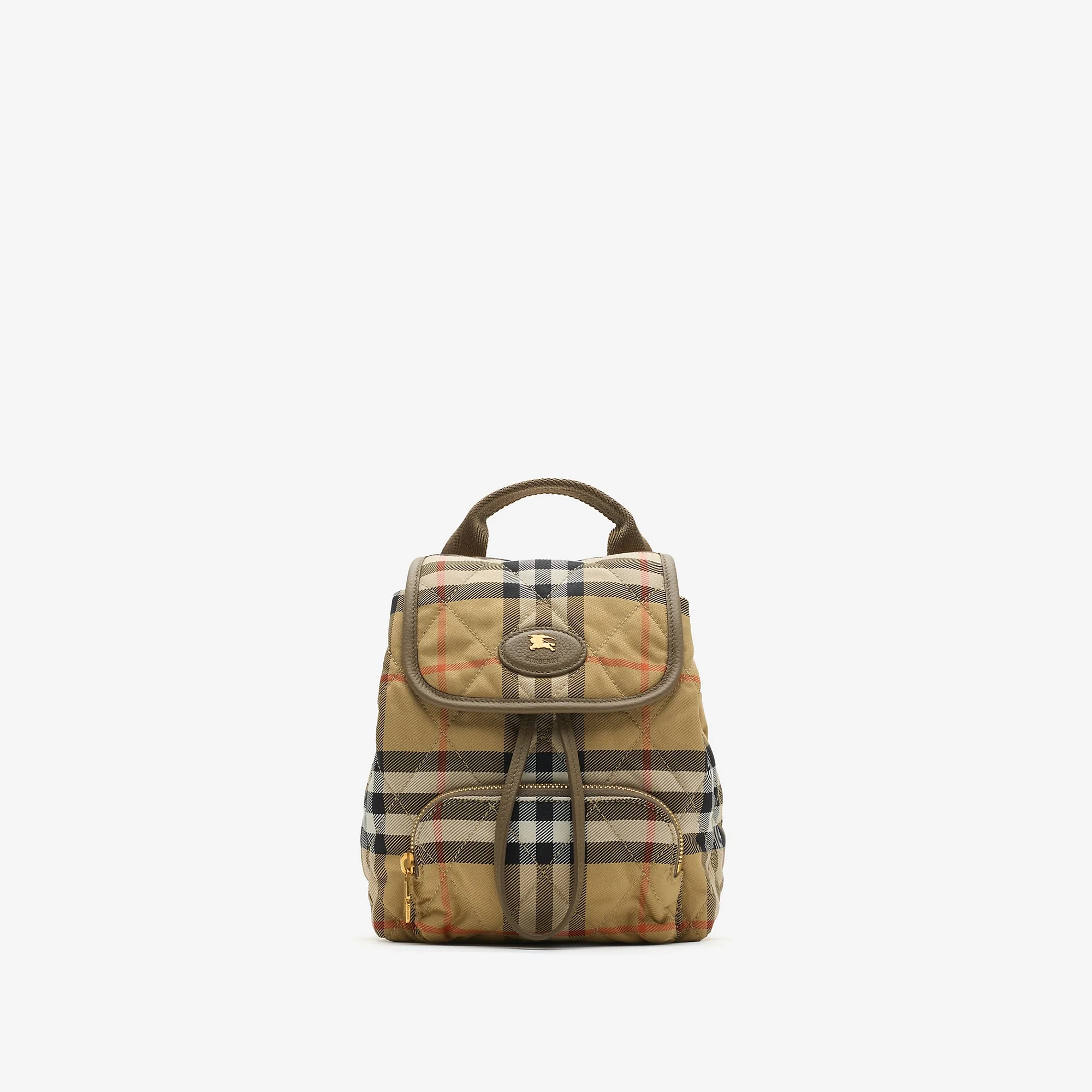 Product Details Inspired by country pursuits, the Horseshoe backpack is made from quilted nylon woven with the Burberry Check in our signature sand beige colourway. The compact design is detailed with leather trims and our Knight stamp, an archival motif first seen on Burberry bags in the 1980s. Use the D-ring at the side to personalise with charms. - Webbing top handle - Adjustable shoulder straps - Foldover top with drawcord and magnetic closure - Exterior zip pocket, interior slip pocket - Brushed metal hardware - Leather patch with Equestrian Knight Design at front - Nylon lining - Comes with a dust bag - Item 81189091 Size & Fit - 17 x 14 x 20cm/6.7 x 5.5 x 7.9in Fabric & Care - Outer: 100% polyamide - Trim: 100% calf leather - Lining: 100% polyamide - Imported