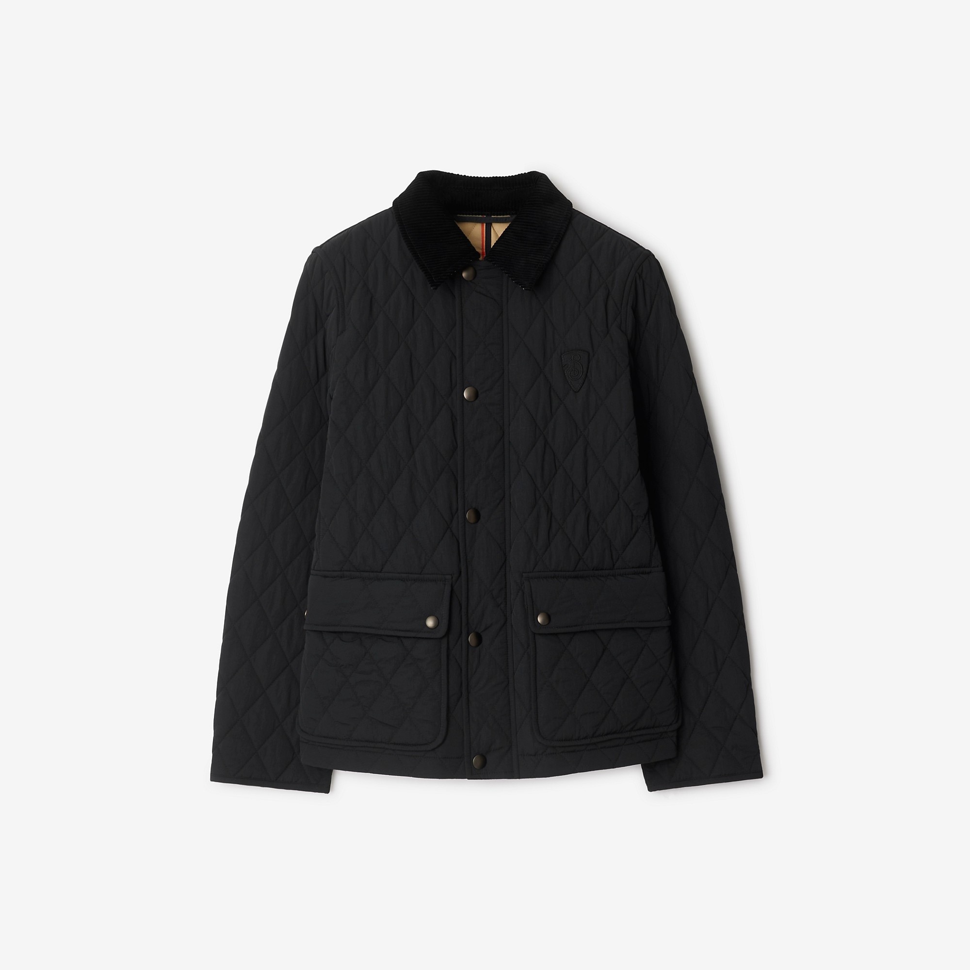 Product Details A quilted jacket in nylon with a tonal corduroy collar and B shield applique. The design is cut to a regular fit and lined in Burberry Check. Part of Burberry Classics, wardrobe foundations with a unique Burberry slant. - Two-way zip and press-stud closure - Side press-stud flap pockets - Press-stud cuffs - Burberry Check lining and undercollar - Appliqued B shield at chest - This item will be packaged in a recycled cotton tote unless the gift packaging option is selected at checkout. - Regular fit. Fits true to size, take your normal size. - Item 80969171 Size & Fit - Length: 64.5cm/25.4in (size UK S) - Model’s height: 177cm/5ft 10in. Model wears size UK S Fabric & Care - Outer: 100% polyamide - Trim: 100% cotton - Lining: 100% cotton - Pocket lining: 100% cotton - Filling: 100% polyester fibres - Specialist dry clean - Imported