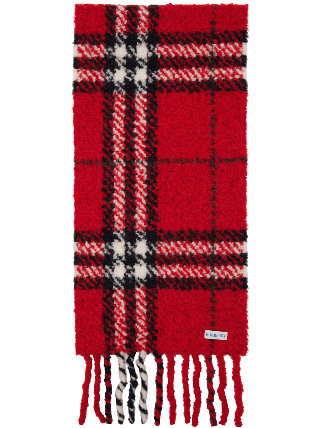 Rectangular alpaca- and wool-blend boucle scarf. · Check pattern throughout · Fringed detailing at ends · L66" x W12" Supplier color: Post red 76% alpaca, 22% wool, 2% polyamide. Made in Italy 261376F028006