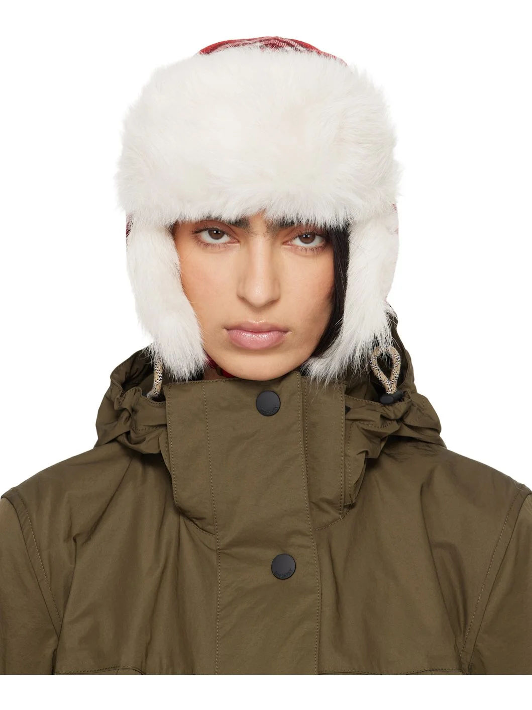 Wool flannel hat. · Check pattern and shearling trim throughout · Press-stud fastening at brim · Padded ear flaps · Cinch chin strap · Cotton herringbone lining Supplier color: Crayon red Body: 100% wool. Trim: 100% lambskin. Fill: 100% polyester. Lining: 100% cotton. Made in Italy 261376F014005