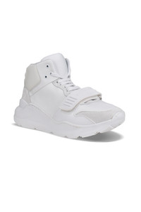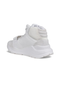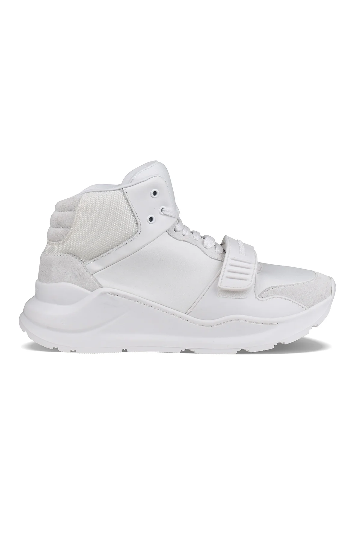 Regis High Burberry sneakers in canvas and white suede. White leather details. White lace-up closure. White rubber scratches with logo. Thick white rubber sole. Embossed logo on back of sole. Made in Italy.