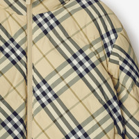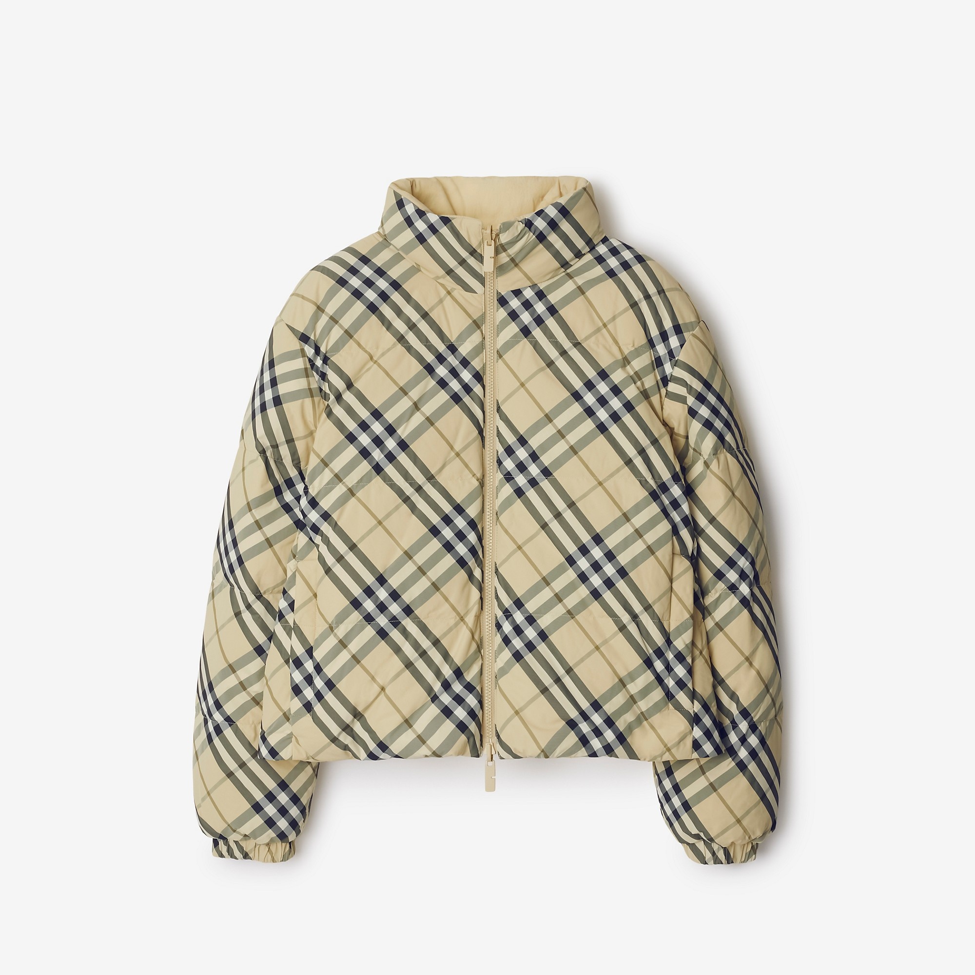 Product Details A puffer jacket in nylon, filled with goose down and feathers. The reversible design switches from Burberry Check to a solid colour screen-printed with an archival logo, first used in 1912 and updated with a distressed effect. The style is cut to a relaxed fit and features a packaway hood. - Two-way zip closure - Packaway drawcord hood - Side zip pockets; reverse press-stud welt pockets - Elasticated cuffs - Screen-printed Burberry lettering at back - This item will be packaged in a recycled cotton tote unless the gift packaging option is selected at checkout. - Relaxed fit: a looser cut than our regular fit. - Machine wash - Item 80984881 Size & Fit - Length: 55cm/21.7in (size UK S) - Model’s height: 177cm/5ft 10in. Model wears size UK S Fabric & Care - Outer: 100% polyamide - Reverse: 100% polyamide - Filling: 90% goose down, 10% goose feathers - Wadding: 100% polyester fibres - Imported