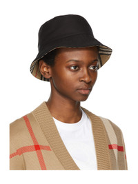 Reversible cotton canvas bucket hat featuring signature check pattern in beige, red, white, and black. Eyelet vents at crown. Approx. 2.5" brim length. Reverse in black cotton twill. Tonal logo bonded at side. Supplier color: Archive beige 100% cotton.