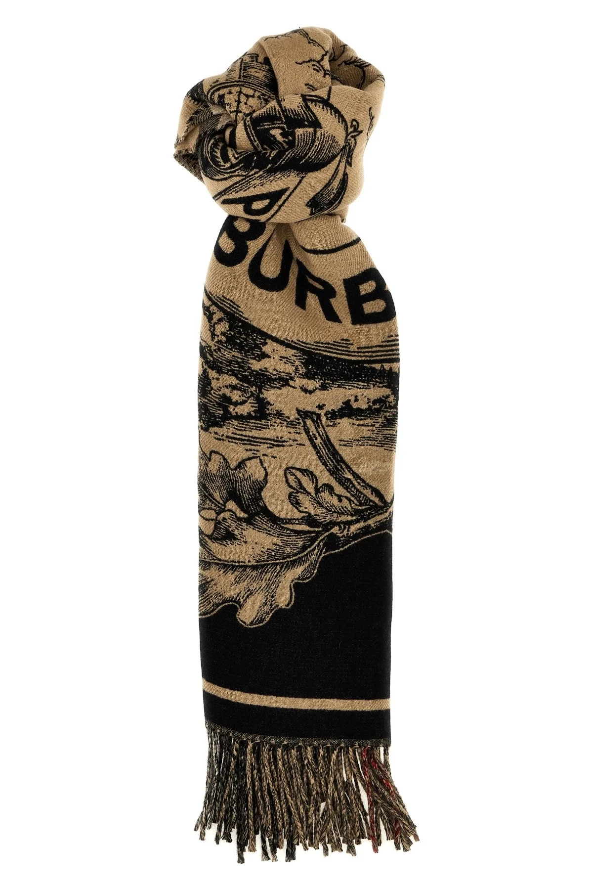 cod. 8073768ARCHIVEBEIGE Reversible cashmere scarf with jacquard processing, one side Equestrian Knight Design print and one Burberry Check print, fringes. Color: Multicolor Size & Fit: 210 x 50 cm Composition: 100% cashmere Made in: Italy