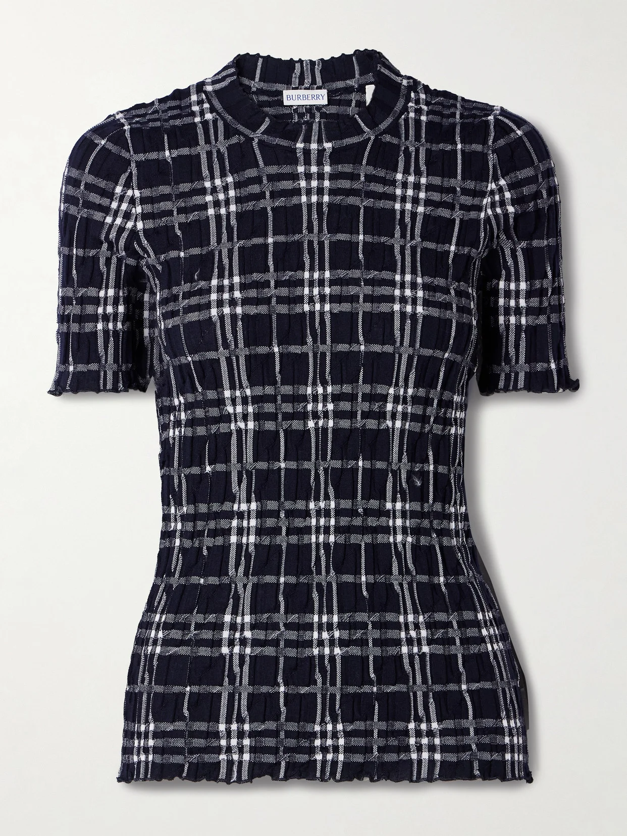Burberry''s T-shirt is cut from a wool-blend and has tactile ribbing that enhances the figure-hugging fit. It's patterned with the house's iconic checks and has delicate lettuce trims.
