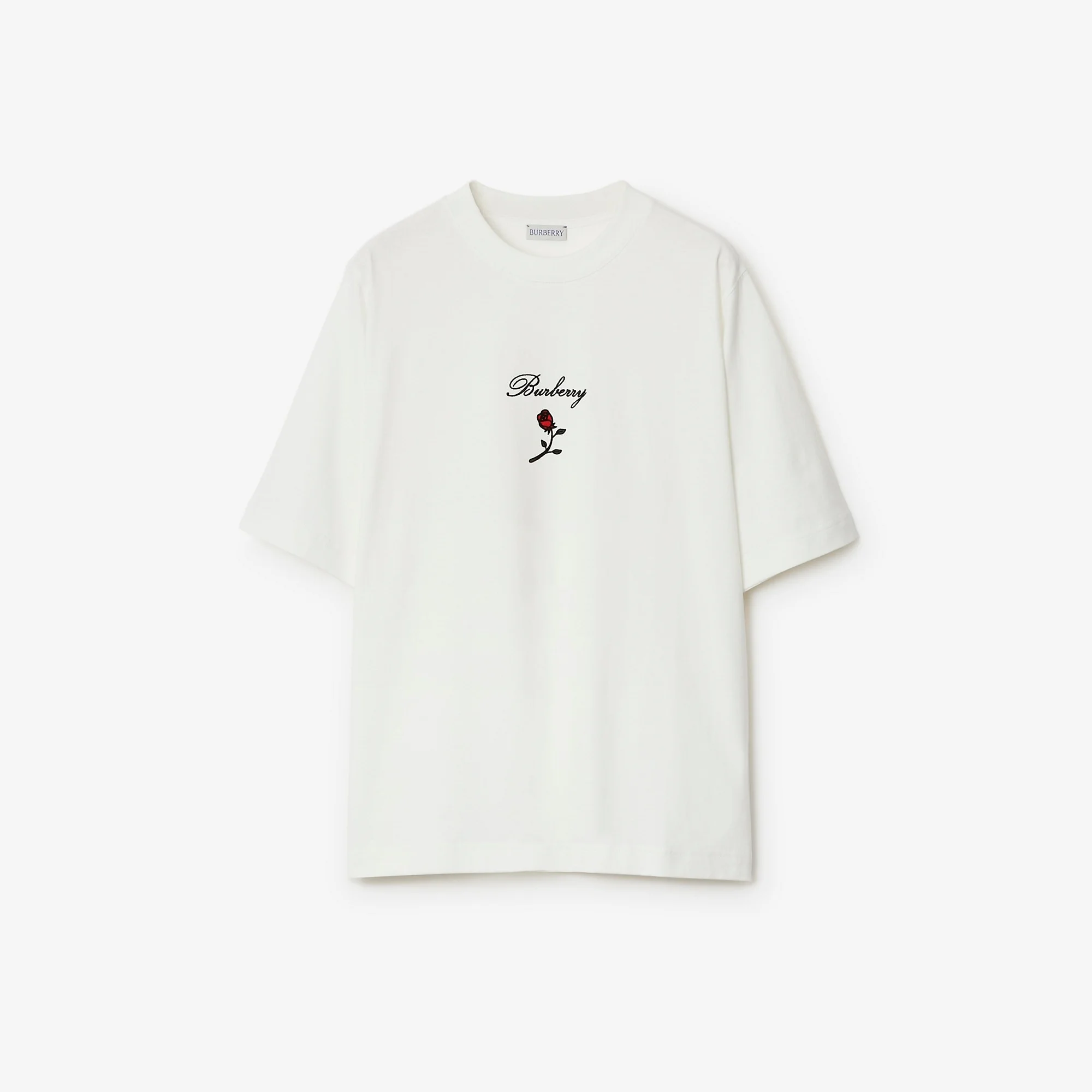 Product Details A cotton jersey T-shirt with a flocked rose motif and embroidered logo. The crew-neck style is cut to an oversized fit. - Rib-knit neckline - Embroidered Burberry lettering at front - Oversized fit: our loosest cut, designed for exaggerated proportions. We recommend sizing down. - Machine wash - *Containing organic cotton - Item 80836471 Size & Fit - Length: 67.5cm/26.6in (size UK S) - Model’s height: 177cm/5ft 10in. Model wears size UK S Fabric & Care - 100% cotton* - Trim: 98% cotton, 2% elastane - Made in Portugal