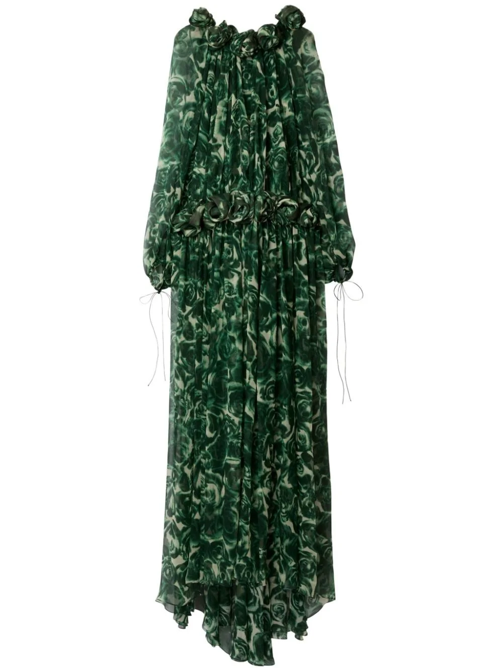 rose silk maxi dress Highlights - Green - Silk - Chiffon - All-over rose print - Round neck - Floral applique - Bishop sleeves - Drawstring cuffs - Long length - Curved hem Made in Italy Composition Silk 100% Washing instructions Dry Clean Only