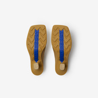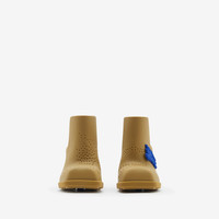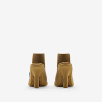 PRODUCT DETAILS A pair of mules in rubber with perforations in the shape of our Equestrian Knight Design. Made in Italy with Burberry lettering at the sole. - Heel height: 9cm/3.5in Upper: 100% rubber Lining: 100% sheep leather Heel: 100% thermoplastic polyurethane Sole: 80% rubber, 20% ABS Made in Italy Item 80864471