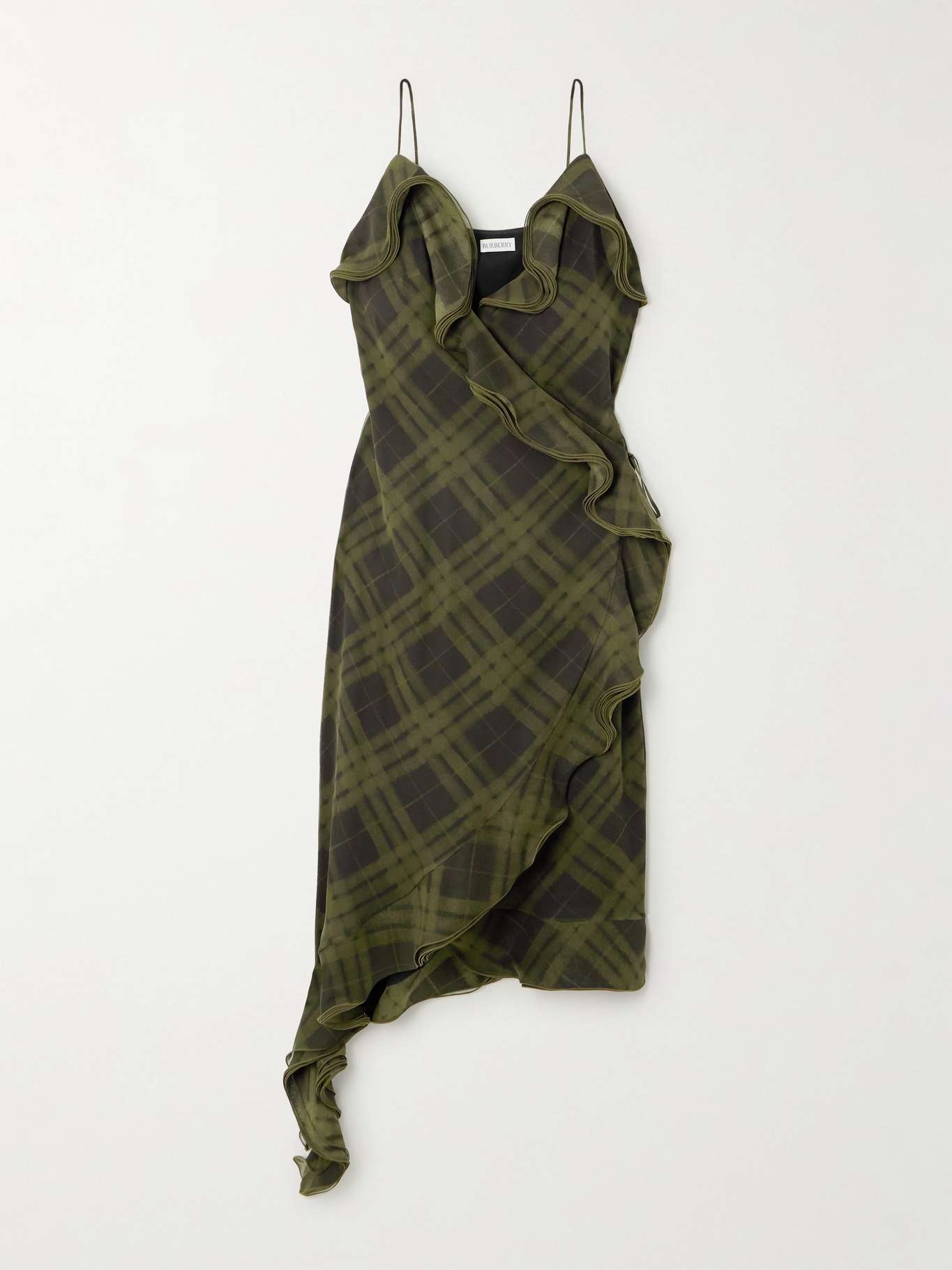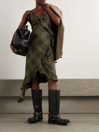 EDITORS'NOTES Burberry’s dress is cut from silk-crepe and patterned with the house’s signature checks. It has flouncy ruffles that trace all the way to the asymmetric hem. Complement the scoop neckline with a choker. SIZE & FIT Model measurements: - Fits true to size, however those who are between sizes should take the smaller size - Cut for a slightly loose fit, use the tie belt to cinch in at the waist - Mid-weight, non-stretchy fabric - Model is 175cm/ 5'9" and is wearing a UK 6 - Bust: 79cm/ 31" - Waist: 61cm/ 24" - Hip: 89cm/ 35" DETAILS & CARE - Army-green and charcoal silk-crepe - Slips on - 100% silk - Dry clean