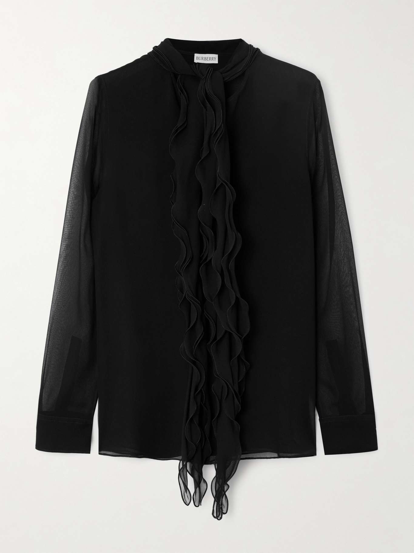 EDITORS'NOTES Defined by origami-inspired folds and ruffles through the front, Burberry’s blouse is cut from Mulberry silk-chiffon, prized for its smooth handle and rich luster. Keen eyes will spot the scalloped edges tracing the smart stand collar. SIZE & FIT Model measurements: - Fits true to size, take your normal size - Designed for a slightly loose fit - Lightweight, fluid, non-stretchy fabric - Model is 180cm/ 5'11" and is wearing a UK 8 - Bust: 81cm/ 32" - Waist: 63cm/ 25" - Hip: 91cm/ 36" DETAILS & CARE - Black silk-chiffon - Concealed button fastenings through front - 100% silk - Dry clean