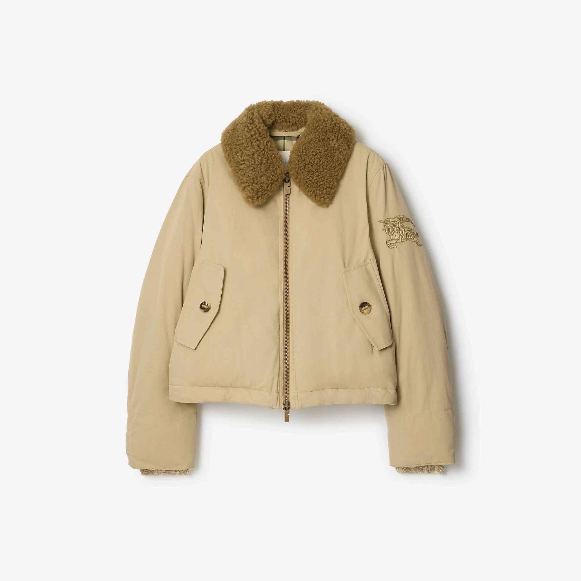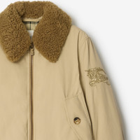 Product Details Regular fit. Fits true to size, take your normal size. A jacket in cotton nylon gabardine, washed for a soft finish and padded with goose down and feathers. Part of our Gabardine Capsule, the design pays homage to the house’s iconic signature – a revolutionary fabric invented by Thomas Burberry, worn by explorers and everyday adventurers alike. Inside the jacket is lined with the Burberry Check and features a specially designed label inspired by an archival campaign. Cut to a regular fit, the style is finished with a detachable shearling collar and our Equestrian Knight Design embroidered in metallic threads. - Two-way zip closure - Detachable collar - Side button flap pockets - Drawcord hem - Velcro-tab and storm cuffs - Embroidered Equestrian Knight Design at sleeve - Comes with a garment bag - Item 81137201 Size & Fit - Regular fit. Fits true to size, take your normal size. - Length: 54cm/21.3in (size UK S) Fabric & Care - Outer: 68% cotton, 32% polyamide - Collar: 100% real farmed dyed lamb shearling, ovis aries, country of origin: Iceland - Trim: 87% wool, 6% polyamide, 5% cashmere, 2% elastane - Linings: 100% cotton; 100% polyester - Sleeve lining: 100% polyester - Filling: 80% goose down, 20% goose feathers - Buttons: buffalo horn - Specialist dry clean - Imported
