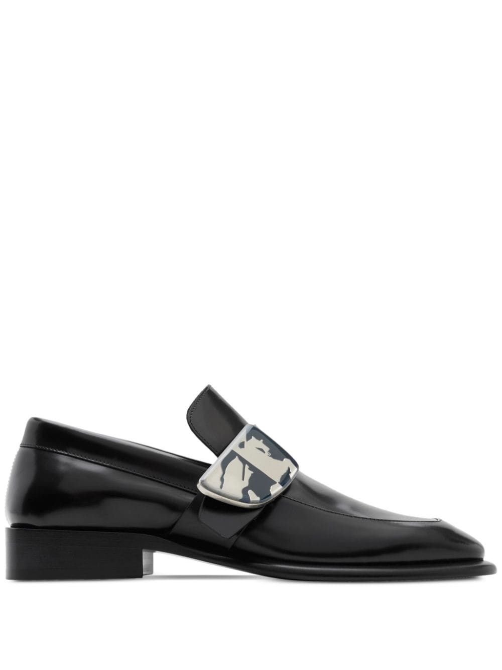 Shield leather loafers Highlights - Black - Calf leather - Signature equestrian knight motif - Decorative plaque - Strap detailing - Square toe - Slip-on style - Branded leather insole - Leather outsole Made in Italy Composition Lining: Calf Leather 95%, Goat Skin 5% Outer: Calf Leather 100% Sole: Calf Leather 95%, Thermoplastic Polyurethane (TPU) 5%