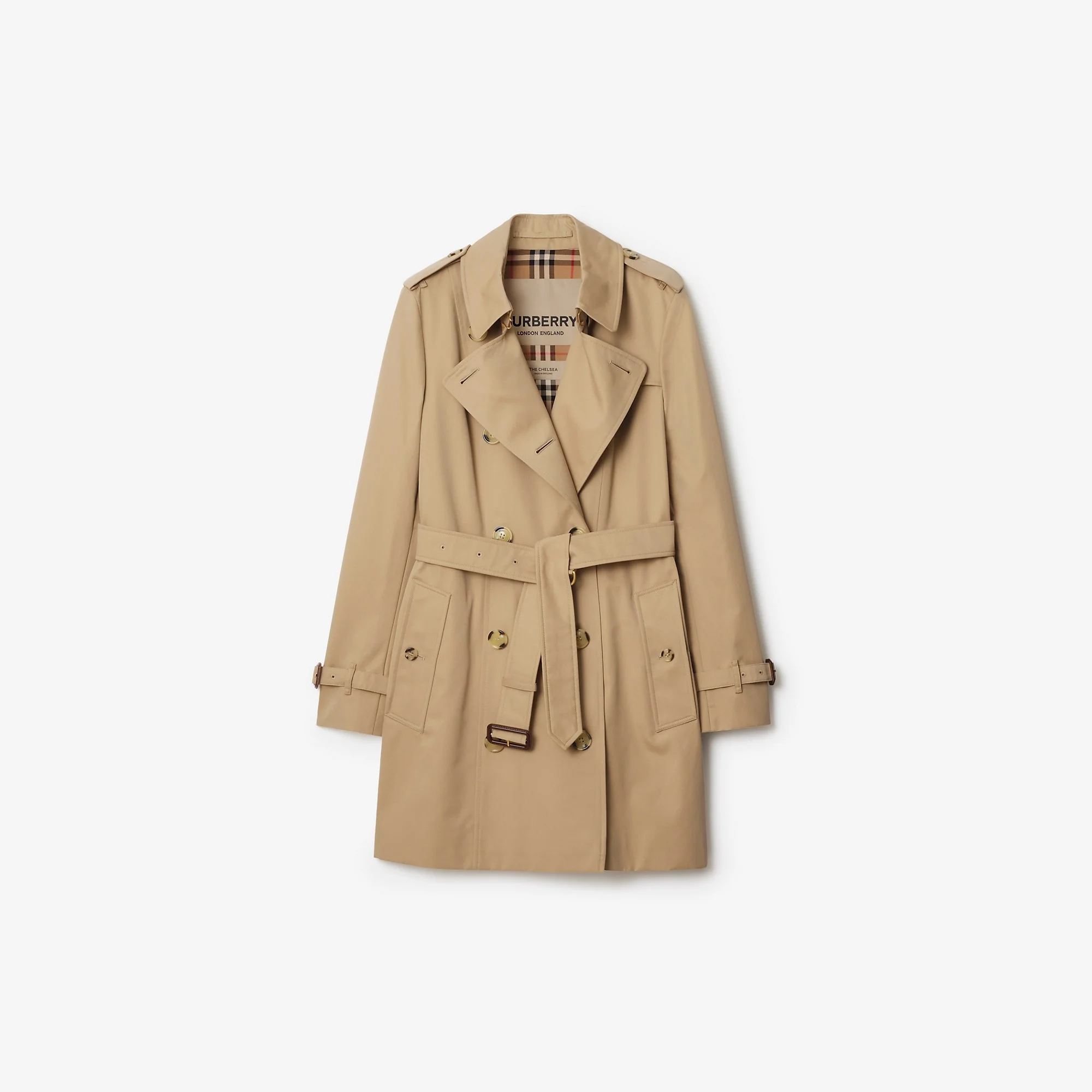 Product Details The iconic Burberry trench coat, made in England from shower-resistant cotton gabardine. Inside is Burberry Check cotton, used to line our coats since the 1920s. Part of the Heritage Collection, the Chelsea is cut to a slim fit with set-in sleeves. Double-breasted button closure Hook-and-eye collar closure Throat latch Epaulettes Belt Side button welt pockets Belted cuffs Back button vent Burberry Check lining and undercollar - Slim fit: this style is cut to a fitted silhouette. Fits true to size, take your normal size. - Item 80794081 Size & Fit - Length: 85cm/33.5in (size UK 6) - Model’s height: 177cm/5ft 9in. Model wears size UK 6 Fabric & Care - Outer: 100% cotton - Lining: 100% cotton - Sleeve lining: 100% viscose - Buckles: 100% calf leather - Specialist dry clean - Made in Yorkshire, England