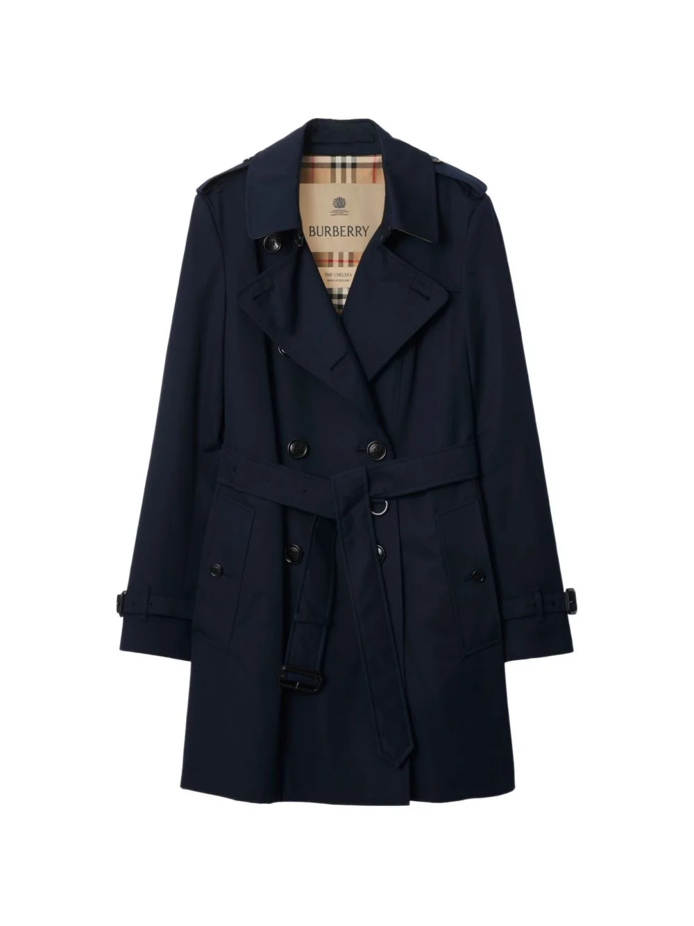 short Chelsea heritage trench coat Highlights - A refined take on burberry’s rainwear heritage, the chelsea trench coat is cut close to the body for a clean, modern silhouette. the fitted style is made in england from shower-resistant cotton gabardine and detailed with leather-wrapped buckles. tailored to a slim fit, the double-breasted design has a structured shoulder line, narrow sleeves, and a defined waistline. wear it closed using the belt or open over dresses and separates to showcase the iconic check lining. - Double-breasted button closure - Hook-and-eye collar closure - Throat latch - Epaulettes - Storm shield at back - Gun flap at shoulder - Leather buckle belt and cuffs - Side button welt pockets - Back button vent - Burberry check lining and undercollar - Comes with a garment bag - Slim fit: this style is cut to a fitted silhouette. fits true to size, take your normal size. Made in United Kingdom Composition Outer: Cotton 100%, Calf Leather 100% Lining: Cotton 100%, Viscose 100% Washing instructions Specialist Cleaning