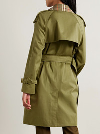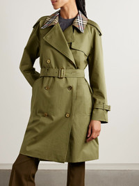 A Burberry trench coat is a true wardrobe hero you'll reach for season after season. This version is cut from green cotton-twill and fastens with metallic double-breasted buttons. The signature checked lining extends to the notched lapels, too. Size & Fit - Fits true to size, take your normal size - Designed for a loose fit, use the belt to cinch in at the waist - Mid-weight, non-stretchy fabric - Model is 177cm/ 5'10" and is wearing a UK 8 Details & Care - Green cotton-twill - Button fastenings through double-breasted front - 100% cotton; lining: 100% viscose - Dry clean