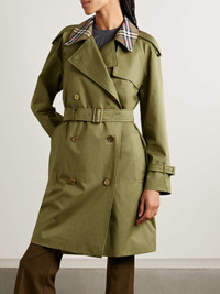 EDITORS'NOTES A Burberry trench coat is a true wardrobe hero you'll reach for season after season. This version is cut from green cotton-twill and fastens with metallic double-breasted buttons. The signature checked lining extends to the notched lapels, too. SIZE & FIT - Fits true to size, take your normal size - Designed for a loose fit, use the belt to cinch in at the waist - Mid-weight, non-stretchy fabric - Model is 177cm/ 5'10" and is wearing a UK 8 DETAILS & CARE - Green cotton-twill - Button fastenings through double-breasted front - 100% cotton; lining: 100% viscose - Dry clean