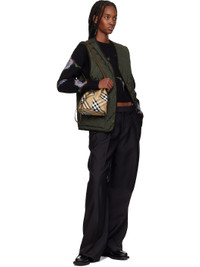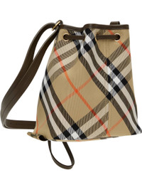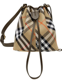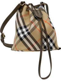 Organic cotton faille shoulder bag in beige. - Buffed calfskin trim with hand-painted edges - Jacquard check pattern throughout - Adjustable shoulder strap - Logo flag at base - Drawstring closure - Unlined - Gold-tone hardware - H7.25 x W6.5 x D4.25 Part of the Burberry Classics collection. Supplier color: Sand