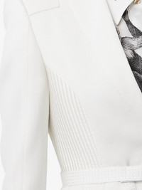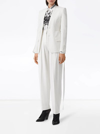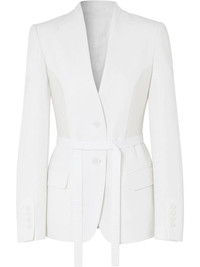 single-breasted belted blazer Time to take your blazer game to a whole new level. Crafted from wool, this snow white single-breasted blazer from Burberry is detailed with satin panels to the waist for an extra refined touch. Ready to step up? Featuring notched lapels, a front button fastening, long sleeves, button cuffs, front flap pockets, a belted waist, a rear central vent and a short length. Made in Italy Composition Lining: Cupro 100% Mulberry Silk 100%, Wool 66%, Viscose 34% Outer: Wool 100% Washing instructions Specialist Cleaning