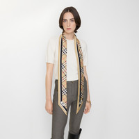 Product Details A skinny scarf made in Italy from silk twill, printed with the Burberry Check. The design is framed with contrasting stripes and our Knight stamp, an archival motif first seen on Burberry bags in the 1980s. - Tapered tips - Printed Equestrian Knight Design at tip - Item 81142381 Size & Fit - 180 x 8cm/70.9 x 3.2in Fabric & Care - 100% silk - Specialist dry clean - Made in Italy
