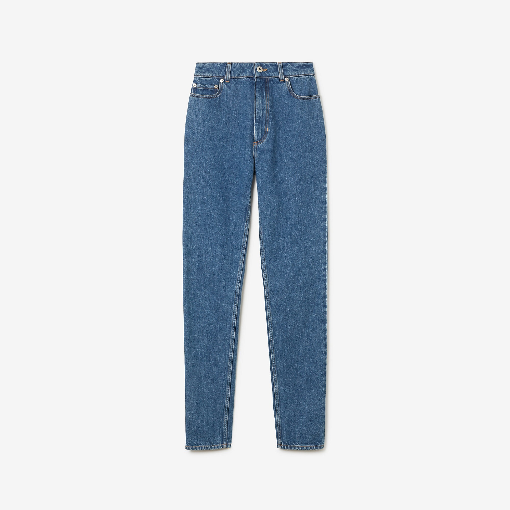PRODUCT DETAILS High-rise jeans detailed with a leather patch embossed with our logo. - Inside leg length: 78cm/30.7in. This is based on a size UK 26. - Model’s height: 177cm/5ft 10in. Model wears size UK 25. 100% cotton Trim: 100% calf leather Heavyweight denim High rise, slim fit Button and zip fly closure Leather patch with embossed Burberry lettering at back Machine wash inside out Made in Italy Item 80669411