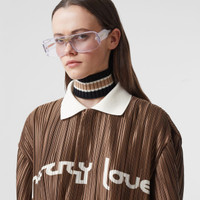 An oversized polo shirt in lightweight satin plissé, accented with a contrast collar and slogan print. This style fits large to size. For a regular fit, please take a size smaller than normal. Polo shirt length: 74cm/29.1in Model’s height: 177cm/5ft 8in. Model wears size UK XL. Outer: 100% polyester Trim: 94% cotton, 3% elastane, 3% polyamide Buttons: buffalo horn Specialist dry clean Made in Italy Item: 45669381