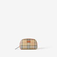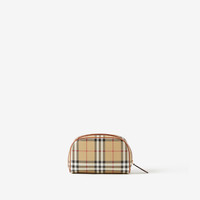 PRODUCT DETAILS A compact travel pouch in Burberry Check, highlighted with a leather patch embossed with our logo. The main material of this product is made with at least 30% bio-based materials. Bio-based materials are derived from renewable natural resources such as plants and castor oil. - 19 x 7.5 x 11.5cm/7.5 x 3 x 4.5in Outer: 71% polyurethane, 16% polyester, 12% cotton, 1% acrylic Trim: 100% calf leather Lining: 71% cotton, 29% polyamide Zip closure Hand-painted edges Polished metal hardware Leather patch with embossed Burberry lettering at front Imported Item 80671591