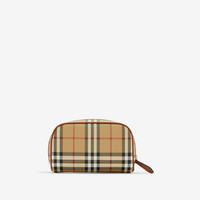 Product Details A compact travel pouch in a coated cotton blend printed with the Burberry Check. The design features a calf leather patch embossed with our logo and is lined in a solid colour. - Zip closure - Hand-painted edges - Polished metal hardware - Leather patch with embossed Burberry lettering at front - Comes with a dust bag - Item 81098111 Size & Fit - 19 x 7.5 x 11.5cm/7.5 x 3 x 4.5in Fabric & Care - Outer: 55% polyurethane, 25% polyester, 20% cotton - Trim: 100% calf leather - Lining: 71% cotton, 29% polyamide - Imported