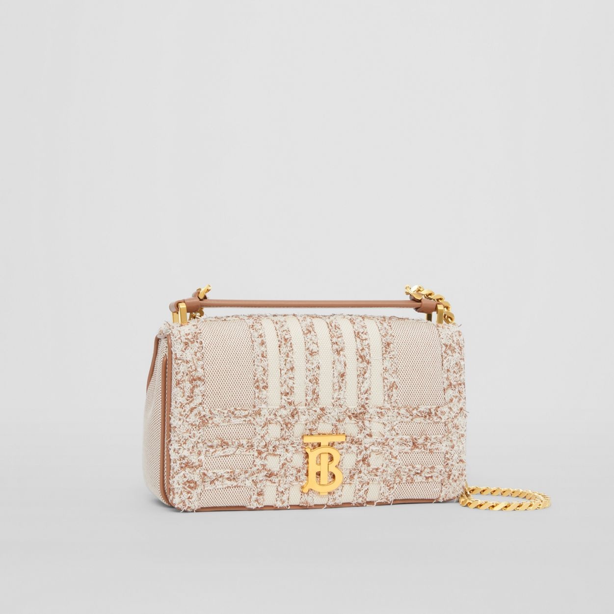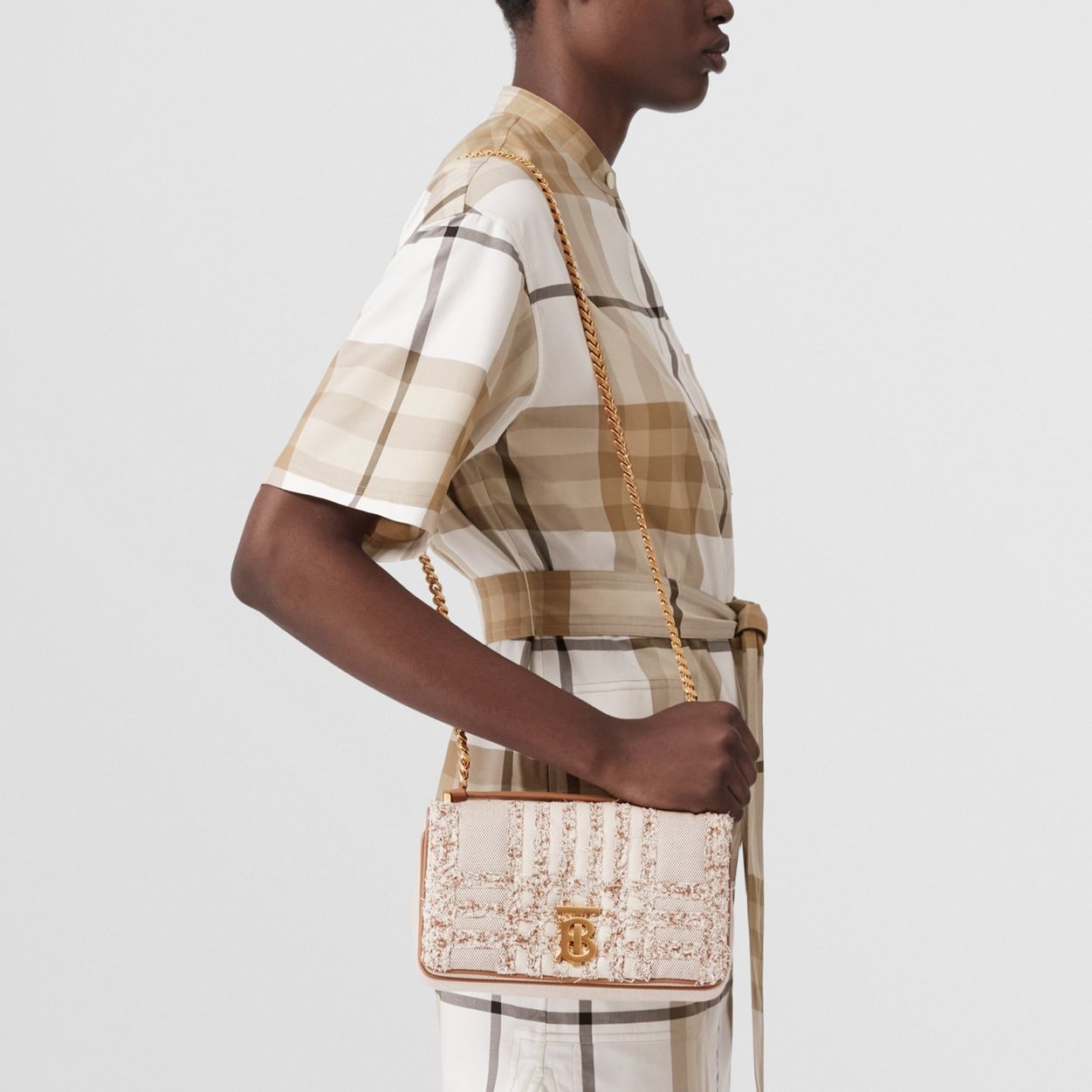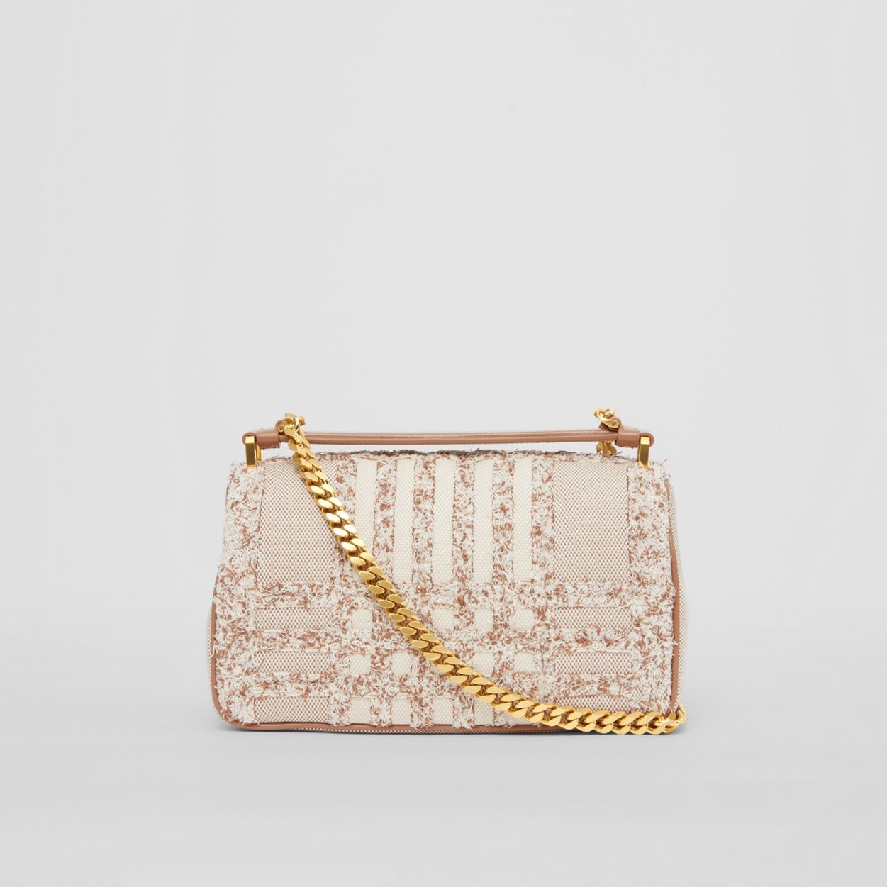 PRODUCT DETAILS A softly structured bag crafted from cotton canvas, highlighted with textural needle punch detailing inspired by the iconic Burberry check. The style is punctuated with a polished chain strap and the Thomas Burberry Monogram. Carry by the leather top handle or wear it on the shoulder. 23 x 6 x 13cm/9.1 x 2.4 x 5.1in Strap drop: 53cm/20.9in Outer: 100% cotton Trim: 100% lambskin Lining: 55% cotton, 45% linen Chain and lambskin shoulder strap One interior slip pocket Foldover top with magnetic closure Hand-painted edges Polished metal hardware Made in Italy 80559721