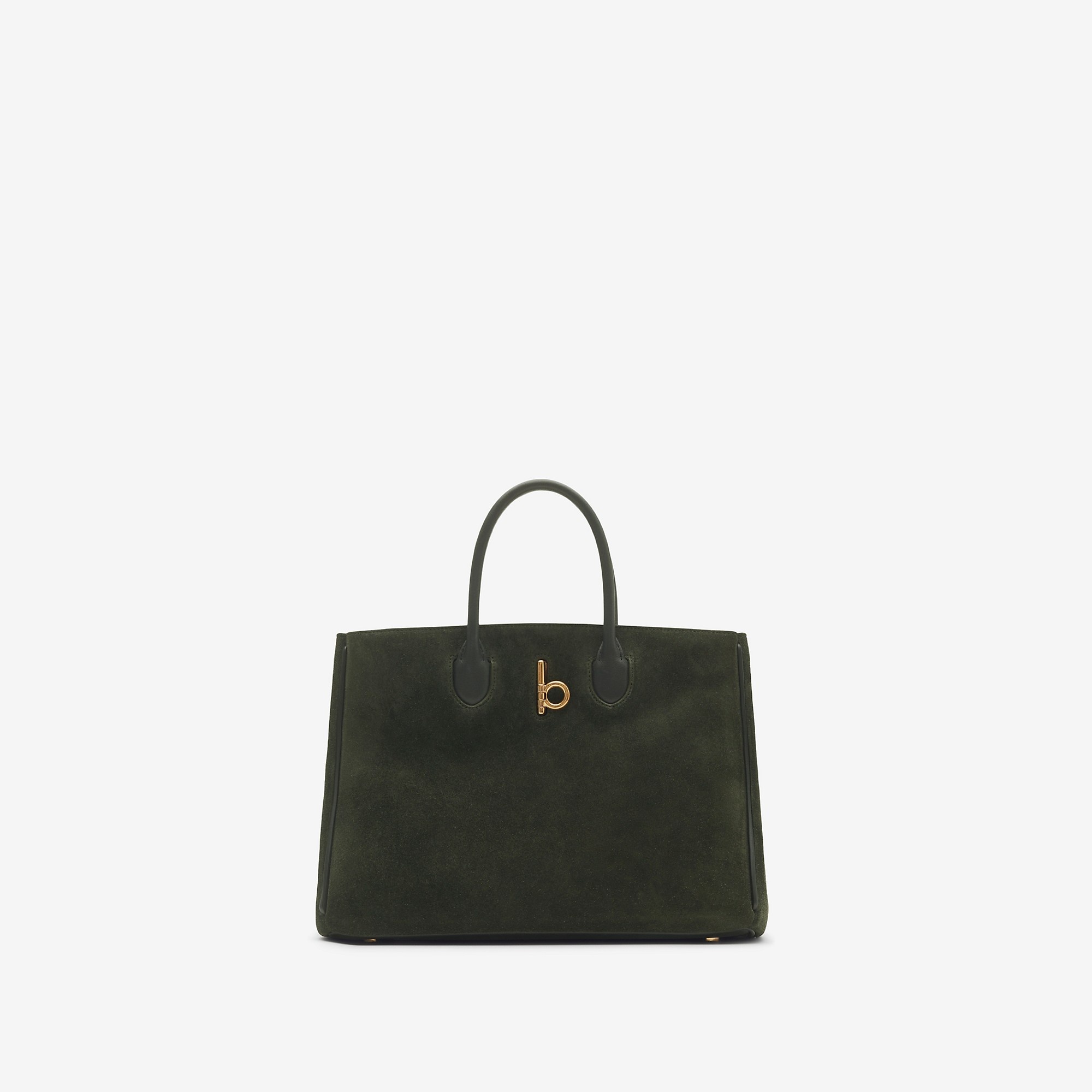Product Details A softly structured tote made in Italy from calf suede and lined in a matching material. The bag features our signature ‘b’ closure and is trimmed with a smooth calf leather panel and top handles. A detachable leather strap switches the design from a handheld to a shoulder style. - Detachable leather strap - Rolled leather top handles - ‘b’ closure - Exterior slip pocket with magnetic closure, interior zip pocket - Hand-painted edges - Brushed metal hardware - Embossed Equestrian Knight Design at back - Calf suede lining - Comes with a dust bag - Item 80995571 Size & Fit - 30 x 13 x 24cm/11.8 x 5.1 x 9.5in. Min. strap drop: 39cm/15.4in. Max. strap drop: 47cm/18.5in Fabric & Care - Outer: 100% calf leather - Trim: 100% calf leather - Lining: 100% calf leather - Made in Italy